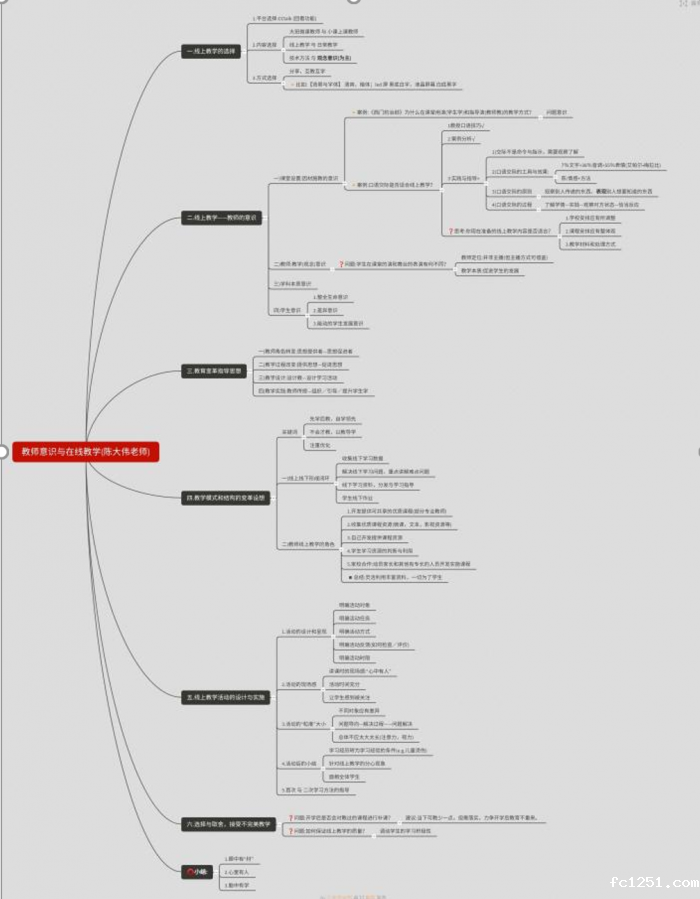 陈大伟教授以自己执教《西门豹治邺》的思考为引子,以一线教师实施线上教学遇到的问题为核心,交流和讨论了线上、日常教学中的教材意识、教学意识、学科意识和学生意识,传递了“眼中有材,心中有人,脑中有学”的教学观念和具体的实践方法。下图为2014年小教专业的蔡莹桥同学用思维导图整理的学习内容:
