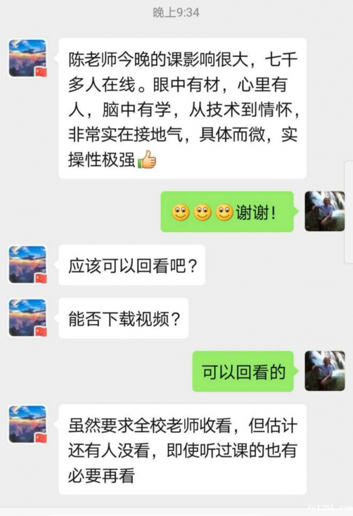交流受到了参与者的充分肯定。有网友留言:“晚上的七点半听您的讲座到九点多结束后,我就一直看您公共号的文章,现在是凌晨四点我仍没有困意,您的文章使我对教育,教学和教师有了新的认识和感触,这将会是我教师生涯中一次新的成长与蜕变!”没有即时在线的一些学校和老师还选了回看(下图为陈大伟老师分享)。